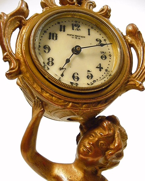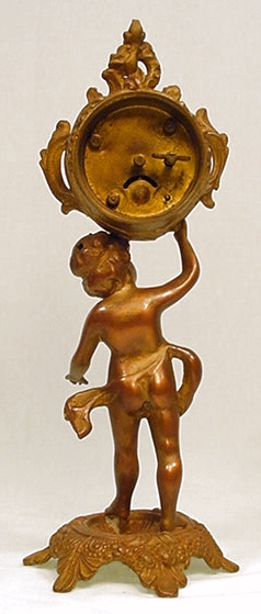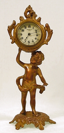 leaf pedestal. This is an excellent example of this model. If you are a collector of these clocks and are picky about condition take a good look at this one. The 30 hour hairspring movement has been cleaned and runs well. |