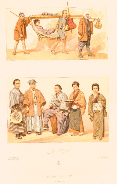 1800's. The print shown here is depicting dress from Japan. The print itself is in very good shape. The colors are vibrant. The entire page is 15 3/4" by 10 1/2". The print section is 8 3/8" by 12". The words on the