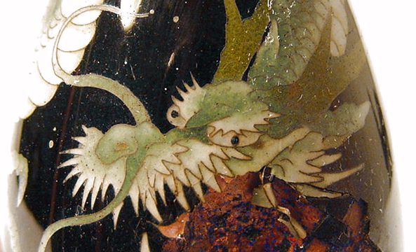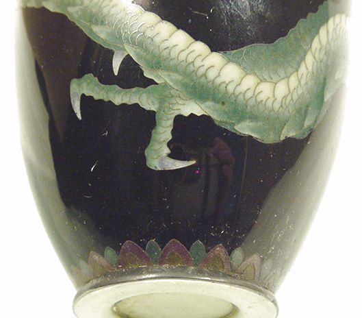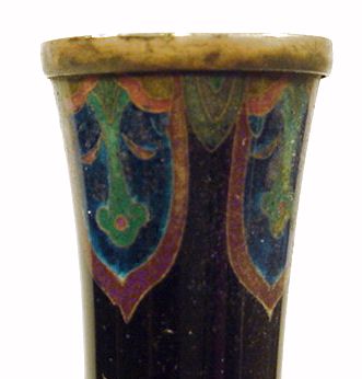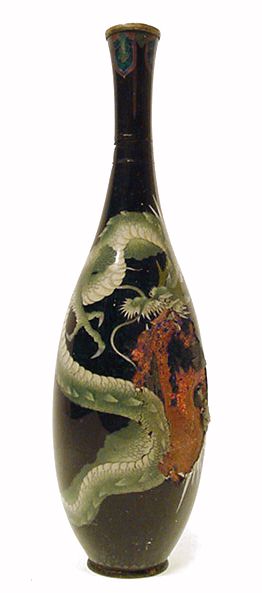 This is an old Cloisonne vase that somehow has been crushed on one side. I have been looking for an undamaged example of this for a very long time and haven't even come close. The vase stands
